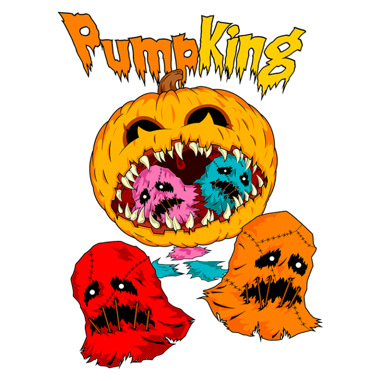 Estampa de DTF: Ilustração de uma abóbora assustadora com dentes afiados, cercada por criaturas coloridas e fantasmas. O texto “PumpKing” destaca o tema de Halloween. Ideal para decoração festiva ou produtos relacionados a festas.